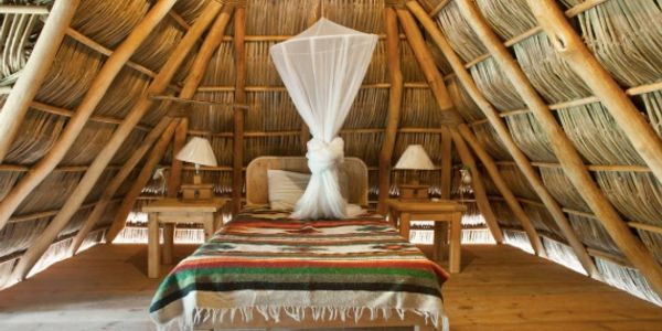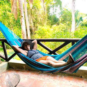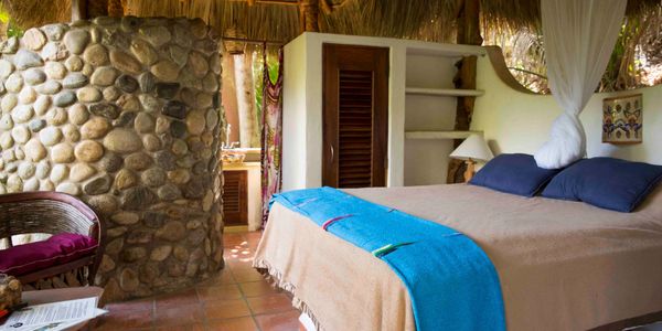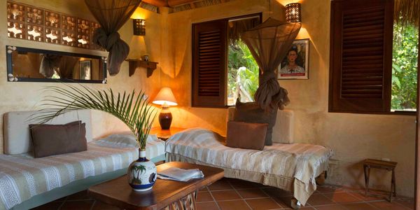 These rooms immerse you in the essence of the jungle. Natural & comfortable, with a rustic romantic tree house feel. You'll never want to leave! Charming Jungle lodging includes: Casita Tejone, Palapa Chiche & Palapa Parota (pictured). Each room has two twin or one king configuration, outdoor showers, and composting toilets.